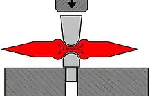 Fullers are typically three to six inches long. If a groove is to be applied to both sides of the steel, two fullers may be used at the same time, sandwiching the workpiece in the middle. Often, one fuller will have a peg that holds it securely in the anvil, while the other fuller will have a handle and a flat head, for striking with a hammer. A blade being fullered will generally be slowly pulled through the fullers as it is being hammered, displacing material to the side (rather than removing it) and thereby creating ridges on either side of a groove. These ridges may be hammered flat, widening the blade, or they are often shaped with other swages, increasing the strength of the blade both by creating thicker areas in its cross section and lateral ridges that resist lengthwise deflection.
