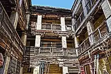 The funduq has a typical layout that matches other caravanserais in Morocco and in Nasrid Granada at the time, consisting of a courtyard surrounded by a multi-storied gallery that gives access to rooms arranged across its three floors.[6][2] It has a usable floor area (after recent restorations) of 437 square metres.[9] The galleries are supported by wooden lintels resting on square pillars, and are lined with wooden mashrabiya-like railings or parapets.[6] The ground floor was most likely used for storage of animals and merchandise, and was the site of trading and commerce, while the upper floors were for sleeping accommodations.[6]