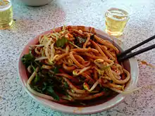 - Tian San Juan Mo (田三卷膜): a type of pancake wrapped in the shape of a cone, stuffed with bean sprouts, tofu, and other ingredients, with sauce on top.[27]