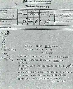 2. If while the surface ships were at sea any opportunity arose for joint action with U-boats, every effort should be made to exploit it to the full. For this purpose an experienced U-boat Officer would be appointed for duty to the Bismarck.3. On the radio frequency used by the U-boats, the Admiral commanding the fleet would be kept constantly informed of the dispositions of the boats and the intentions of the U-boat Command.[55]