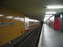 Güntzelstraße is a Berlin U-Bahn station on the U9 line. It is located in the central Wilmersdorf district of the city. The station designed by the BVG architect Rainer G. Rümmler opened on 29 January 1971 with the line's extension from Spichernstraße to Walther-Schreiber-Platz.[1] The station and the adjacent street are named after Karl August Bernhard Güntzel, mayor of Wilmersdorf from 1886 to 1892.
