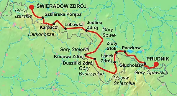 Trailheads | Świeradów-Zdrój 50°54′30″N 15°20′00″E / 50.908333°N 15.333333°E Prudnik 50°19′11″N 17°34′45″E / 50.319722°N 17.579167°E |