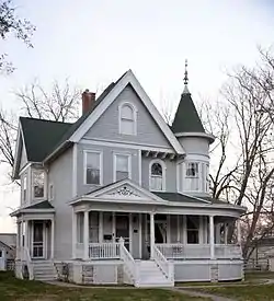 It was constructed according to mail order plans provided by George F. Barber & Co. of Knoxville, Tennessee. The final design is a combination of two designs offered in Barber's 1899 catalog and modifications by the Allens and their builder. It was one of several Barber-designed houses in Mount Pleasant.[2] The 2½-story Queen Anne has an irregular plan, frame construction, a full basement, hip roof with lower cross gables, and circular tower with a conical roof. Because the house is from the later stage of the Queen Anne style it features decorative elements from the Neoclassical and the Neocolonial styles instead of Eastlake detailing.[2] The house was built by George S.W. Allen, a Vermont native, who operated his own clothing store.