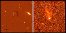 ![]() Optical afterglow of gamma-ray burst GRB 990123 (the bright dot within the white square and in the enlarged cutout) on January 23, 1999. The object above it with the finger-like filaments is its originating galaxy. This galaxy seems to be distorted by a collision with another galaxy. | |
