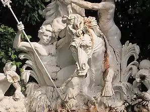 His early work shows a classicist tendency, which may be due to his study period in France. In Brussels, his work was influenced by the Flemish Baroque, and in particular Peter Paul Rubens, and developed into a full-blown Baroque style.[1] A major work that Grupello created in this style in Brussels is the marble wall fountain, intended for the main ballroom of the wholesale fishmongers guild. It is this Baroque style that he brought to Düsseldorf when he moved there. In his later life, he turned more to religious art and produced crucifixes, Madonnas and statues of saints.[1][2]