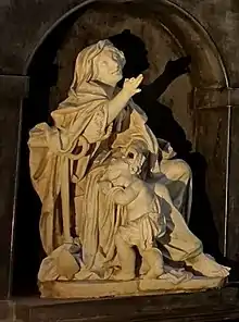 Grupello collaborated from about 1673 to 1678 on the decorative project for the funerary chapel of Duke Lamoral of Thorn and Taxis (in the Our Blessed Lady of Zavel Church in Brussels). This decorative project was initially under the direction of Lucas Faydherbe, a prominent sculptor from Mechelen. Grupello created two allegorical figures representing Hope (Spes) and Faith (Fides), which were placed in niches in the chapel with two other allegorical sculptures of Charity (Caritas) and Truth (Veritas) executed by Jan van Delen.[6] The Charity and Faith (Fides) sculptures were stolen at the end of the 18th century during one of the occupations of the Southern Netherlands by the French. Charity was rediscovered in a French private collection two centuries later and returned to Belgium after a sale at Christie's in 2012.[7] The statue group of Hope (Spes) by Grupello shows a sitting woman personifying hope with an anchor and a child which may be a symbol of the next generation. In other words, the child could represent the son of the Duke of Lamoral who after the early death of his father had to continue the family name and business. The book above Hope refers to the genealogy of the Lamoral family prepared by Jules Chifflet, which had revealed the truth about the family and given a firm basis to the family's claim to its elevated position.[6]