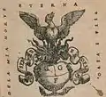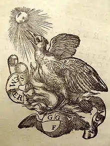 Giolito's press published a mix of Renaissance classics and new authors. Giolito was dedicated to publishing works in the lingua volgare, or Italian vernacular, as opposed to Latin, Greek and other languages not familiar to the common population. Beginning in 1545, his printing house issued the influential collections of lyric poetry entitled 'Rime Diverse' and known today as the 'Giolito Anthologies.' Eight anthologies would follow, not all of them published by Giolito.[1] The poems in these anthologies, especially the first two, would serve as influential models to the French poet Joachim du Bellay.[2] He was also famous for his 1555 edition of Dante Alighieri's Commedia, edited by Lodovico Dolce and for the first time published with the title Divina Commedia. Giolito was also well known for his printer's mark, which had many variations but was most often represented by a phoenix emerging from flames atop a globe with the initials G.G.F.[3]