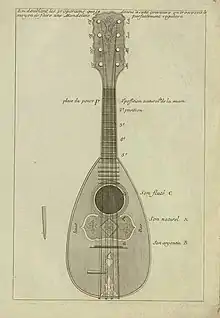 His mandolin method was meant to help students of the violin switch to the mandolin, "from bow to feather" without the need for a teacher, using sheet music marked with "conventional signs" to guide learners.[5] Feathers were used as plectrums in that era, as they had been when playing the mandore. The method contained 26 dancing tunes, 6 minuets, 2 duos, a sonata and some airs.[1]