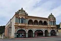 Draper and hotelier Edward Mulcahy M.H.A[6] built a timber hotel called the Royal Exchange on the site of an abandoned silver and lead mine in 1882. Although it was destroyed by fire in 1884,[7] Mulcahy assembled his own and other capital to enter into a new enterprise for the Gaiety Theatre and Grand Hotel on the same site. The destruction of the Royal Exchange and his personal loss of £5,000 was strong in Mulcahy's mind, so the new building was constructed of brick, the first of which were being made at that time in Zeehan by resident John Connor. Completed in 1898,[8] the Gaiety Theatre and Grand Hotel cost a staggering £7,075.[9] The building is notable for its unusual coupling of a hotel and theatre.