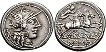 Gaius is first mentioned in the sources as a supporter of Tiberius Gracchus, the famous social reformer and tribune of the plebs in 133.[6][4] Gaius probably met him within the Scipionic Circle—the literate court of Scipio Aemilianus—as Tiberius was also Scipio's brother-in-law.[7] Gaius first recorded position was as triumvir monetalis in 123, the year of the first tribunate of Gaius Gracchus, which suggests he also supported Tiberius' younger brother.[8] It seems that he deserted the cause of the Gracchi soon after though, as he was later prosecuted by a Gracchan court.[9] Cicero describes him as a "mediocre orator".[10][11]