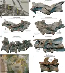 The back of Gallimimus had 13 dorsal vertebrae, with spool-like centra that were short, but tended to become deeper and longer towards the back. Their transverse processes (processes articulating with the ribs) slightly increased in length towards the back. The two first dorsal centra had deep pneumatic foramina, while the rest only had shallow fossae (depressions), and the neural spines were prominent being somewhat triangular or rectangular in shape. The sacrum (fused vertebrae between the pelvic bones) consisted of five sacral vertebrae which were about equal in length. The centra here were spool-like, flattened sideways and had fossae which appear to have continued as deep foramina in some specimens. The neural spines here were rectangular, broad, and higher than those in the dorsal vertebrae. They were higher or equal in height to the upper margin of the iliac blade and were separate, whereas in other ornithomimids they were fused together. The tail had 36–39 caudal vertebrae with the centra of those at the front being spool-shaped, while those at the back were nearly triangular, and elongated across. The neural spines here were high and flat, but diminished backwards, where they became ridge-like. The only sign of pneumaticity in the tail were deep fossae between the neural spines and the transverse process of the two first caudal vertebrae. All the vertebrae in front of the sacrum bore ribs except for the atlas and the last dorsal vertebra.[1][25]