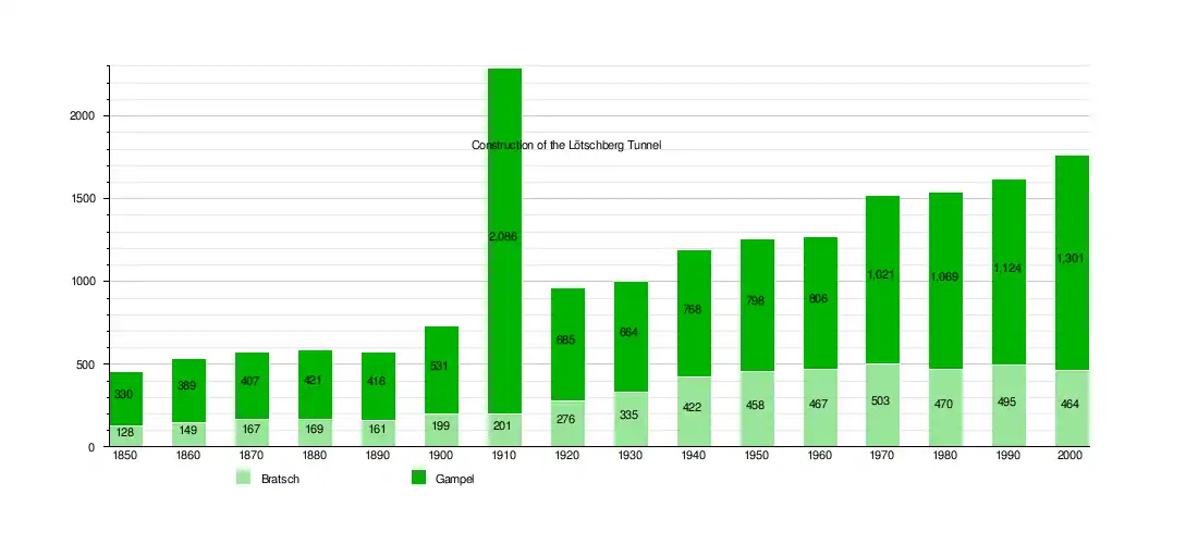 Gampel-Bratsch has a population (as of December 2020) of 1,997.[7] As of 2008, 10.7% of the population are resident foreign nationals.[8] Over the last 10 years (1999–2009 ) the population has changed at a rate of -1.5%. It has changed at a rate of 1.4% due to migration and at a rate of 0.3% due to births and deaths.[6]