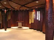 The front wall is faceted to allow plaques to be placed on the wooden screens. Two rough-hewn posts stand in the body of the chapel. The altar is a simple wooden block of a sandstone plinth, standing on a raised area at the front wall.