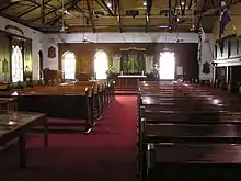 The main chapel is on the upper level of the building, accessed by a winding staircase from the main entrance. The layout was formerly with two equal lines of pews, until the modernisation when the Chapel of Remembrance was constructed. At that time the original stairs were removed and a staircase was erected from the new entrance. The Chapel of Remembrance could also be incorporated into the overall design of the space.