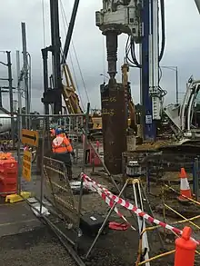During 2015, construction began on the project with piling works and service relocations to create the rail trench. Major construction ramped up with closures of the Glen Waverley line to facilitate further piling and excavation works.[21] In September 2015, demolition of the original station occurred alongside the opening of a temporary station to continue to facilitate rail services.[22] Once the temporary station opened, major excavation works were able to begin. Construction of the station also occurred during this time, with the prefabricated station buildings installed and platforms installed.[23] With works continuing throughout the rest of 2015, the level crossing was removed in early 2016 with the reopening of Burke Road and Gardiner station.[24] The station opened in a basic state, with elevators, paving, additional exits, and other facilities opening later in early 2016. In April 2016 came the completino of the newly resurfaced carpark, the new tram super-stop located 100 m (328 ft) north of the station, landscaping, and the rebuilt Gardiner Park—used by the project team as vehicle storage and site office facilities throughout the duration of the project.[20][24] The redevelopment of Gardiner Park included the construction of a new clubhouse, the installation of a fake grass playing field, and a new playground.[20]