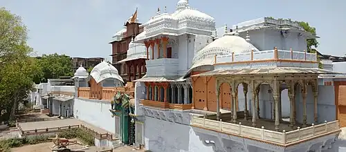 The palace also houses Gulab Mahal, Purana Mahal, Arjun Mahal, Hava Mahal, Diwan-e-Aam, Akhada Mahal, Kanvarpadi. The wall paintings depicting floral and faunal diversity, hunting scenes, processions and scenes from the legend of Lord Krishna are common feature on these royal apartments.[8][9]