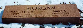 He married Madge Nelson in 1896, only to divorce in 1898. In 1908, he and Czech-immigrant Mary Hasek were married.[31] Together, they had three children: John P., Garrett A. Jr., and Cosmo H. Morgan. Garrett died in Cleveland in 1963, where he was buried in Lake View Cemetery.[32]