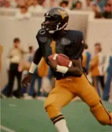 Mullen attended West Virginia University after high school, where was a member of the Mountaineers football team from 1981 to 1984.[1] After his freshman season, Mullen considered a transfer, but decided to stick it out after speaking with Risha.[5] Mullen spent two years as a reserve wide receiver for the Mountaineers, but he continued to work hard to earn more playing time.[7] Mullen earned playing time in 11 games during the 1983 season, amassing 19 receptions for 343 yards and three touchdowns. Mullen was also utilized as a kickoff returner, returning 12 kicks for 237 yards.[8] Mullen's senior year at West Virginia was his most productive statistically, as he caught 31 passes for 557 yards and three touchdowns. In total, Mullen amassed 80 receptions for 1,332 yards and six touchdowns during his collegiate career.[8] Gary was also part of three Mountaineer bowl game victories: the Peach Bowl in 1981, the Hall of Fame Classic Bowl in 1983, and the Bluebonnet Bowl in 1984.
