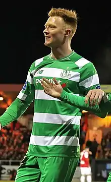 2017 was a brilliant season for Shaw as he scored 11 goals in 28 league games for the Hoops, making 10 further appearances in cup competitions, including all UEFA Europa League qualifiers as the Hoops knocked out Stjarnan of Iceland courtesy of a Shaw winning goal away from home, before being knocked out by FK Mladá Boleslav of the Czech Republic.[12][4] Rovers bettered their 4th-place finish of the previous season by finishing 3rd, as well as being knocked out of the FAI Cup in a semi-final replay vs Dundalk, having also lost in the League of Ireland Cup Final to the same opposition.[13] At the end of the season, Shaw was named as Shamrock Rovers Player of the Year.[14]