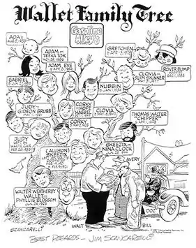 The strip is still published in newspapers in the 21st century. Walt Wallet is now well over a century old (115, as of April 2015[9]), while Skeezix has become a centenarian. Walt's wife Phyllis, age an estimated 105, died in the April 26, 2004, strip; Walt was left a widower after nearly eight decades of marriage. Walt Wallet appeared as a guest at Blondie and Dagwood's anniversary party, and on Gasoline Alley's 90th anniversary, Blondie, Beetle Bailey, Dennis the Menace, and Snuffy Smith each acknowledged the Gasoline Alley anniversary in their dialogue. Snuffy Smith presented a character crossover with Walt in the doorway of Snuffy's house where he was being welcomed and invited in by Snuffy.[10] In May 2013 at the cartoon retirement home, Walt is at a dinner when Maggie's (of Bringing Up Father) pearl brooch is stolen; Fearless Fosdick is his usual incompetent self trying to catch the thief; cameos include such "retired" comics characters as Lil' Abner; Smokey Stover and Pogo and Albert. Even the active cartoon character Rex Morgan, M.D., appears.