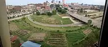 Founded in 2005, the Gateway Greening Urban Farm (GGUF) came about through collaboration between several St. Louis organizations and the awarding of a Community Food Project Grant from the United States Department of Agriculture Cooperative State Research, Education, and Extension Service (CSREES). At the time of its funding, the farm's mission was to “increase production and distribution of locally grown fresh food for low-income residents, increase self-sufficiency in populations experiencing addictions, mental illness, and homelessness, and provide neighborhood based nutrition and food preparation programs.”[34] While the initial plan was to establish the farm in stages over a period of 3 years, beginning with just 10 raised beds, the increasing demand for services and a timely donation of soil allowed the farm to rapidly expand physically and programmatically within the first year.[35] Today, the farm includes 48 raised vegetable beds, drip irrigation, native plantings, a rain garden, a dwarf fruit tree orchard, ornamental shrub borders, a rainwater catch cistern, a sheltered outdoor classroom, harvest station, composting bins, beehives and more.[32][36][37]