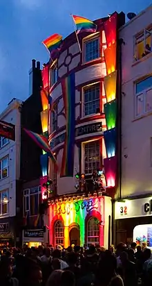 Old Market is the main gay village in Bristol, with its scene centred on West Street.[22] Across the city centre, Frogmore Street in the Old City is a gay area. Queenshilling first opened here in 1992,[23] although the first post-1967 gay club to open in Bristol was the Moulin Rouge on Worrall Road, Clifton, in 1970.[24]