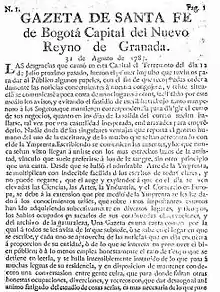 Gazeta de Santafé de Bogotá was a Spanish language newspaper. It was first published in 1785 in Santa Fé de Bogotá, the capital of the Viceroyalty of New Granada (now Bogotá, Colombia).[1][2][3]