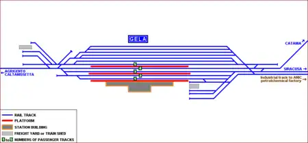 The new Gela station is a modern one-floor building. There is a bus terminus and a large car park. There are 3 platforms and a total of 11 tracks: 5 are used for passenger services, the others only for goods. Due Gela is the biggest station on the line from Syracuse to Agrigento and Caltanissetta, and one of the most important hubs for freight traffic in Sicily.