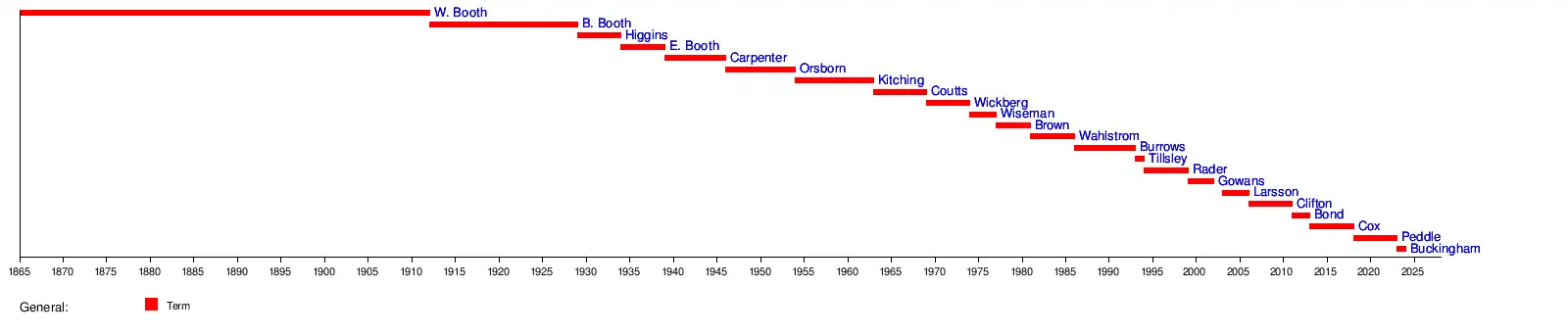 General is the title of the international leader and Chief Executive Officer (CEO) of the Salvation Army, a Christian denomination with extensive charitable social services that gives quasi-military rank to its ministers (who are therefore known as officers). The General is elected by the High Council of The Salvation Army and serves a term of five years, which may be extended to seven years. According to the organisation, the General is purported to be appointed by God, and the council identifies that person.[1] Lyndon Buckingham is the current general, who assumed office on 3 August 2023 upon the retirement of Brian Peddle. The organisation's founder, William Booth, was the first and longest-serving general. There have been 22 generals as of 2023.