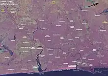 Two rivers meander through Chennai, the Cooum River (or Koovam) in the central region and the Adyar River in the southern region. Both rivers are heavily polluted with effluents and trash from domestic and commercial sources. The Adyar, which is much less polluted than the Cooum, is de-silted and cleaned periodically by the state government. A protected estuary of the Adyar forms the natural habitat of several species of birds and animals. The Buckingham Canal, 4 km (2.5 mi) inland, travels parallel to the coast, linking the two rivers. The Otteri Nullah, an east–west stream runs through north Chennai and meets the Buckingham Canal at Basin Bridge.[14] Several lakes of varying size are located on the western fringes of the city. Red Hills, Sholavaram and Chembarambakkam Lake supply Chennai with potable water. Groundwater sources are mostly brackish. A study by the Department of Geology, Anna University, based on a city map of 1893, has revealed that there were nearly 60 large waterbodies in the core of then Madras.[15] The study traced the shrinking and vanished waterbodies through a series of city maps.[16]