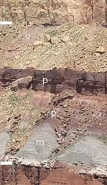 The 50 to 110 foot (15 to 34 m) thick slope-forming Black Dragon is composed of reddish conglomerate, sandstone, and siltstone that were likely deposited on a coastal plain followed by a tidal flat.[6] Chert clasts from the underlying Kaibab Limestone make-up part of conglomerates at the member's base while ripple marks and mudcracks are common in its upper parts. Also common in the upper parts of the member are thin interbeds of carbonate rock with some fossils.[6]
