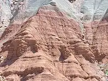 Tidal flat conditions returned as the shallow sea that created the Curtis Formation retreated from land. Thin beds of reddish-brown mudstone alternating with less frequent beds of greenish-gray sandstone and limestone were deposited as sediments, forming the locally 50 to 250 foot (15 to 75 m) thick Summerville Formation.[14] This formation erodes into ledgy cliffs and slopes and can be seen above Curtis caprock in Cathedral Valley. Fossilized mudcracks and ripple marks are found in the Curtis along with up to 28 foot (8.5 m) thick gypsum-rich beds.