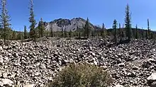 Subsequent to the rise of Lassen Peak, several dacitic pumice cones developed in a rift extending northwest from the base of Lassen Peak. Then about 1,100 years ago several dacitic domes, the Chaos Crags, protruded through these cones and obliterated all but half of the southernmost cone. At least 300 years ago a series of large avalanches, possibly triggered by steam explosions, occurred on the north side of the Crags.[34] These avalanches created their own 'air cushions' that helped accelerate them to speeds exceeding 100 mph (160 km/h) and push them partway up Table Mountain.[34] The resulting wilderness of debris, the Chaos Jumbles, covers an area of 2.5 sq mi (6.5 km2).[1] Manzanita Lake was formed as a result of Manzanita Creek being dammed by the debris.[26] Steam rose from the domes of Chaos Crags until 1857.[34]