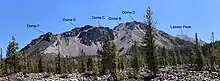 Later, but not precisely dated, eruptions from the Lassen volcanic area have formed over 30 smaller steep-sided, mound-shaped accumulations of volcanic rock, called lava domes.[4] Crescent Crater, which at first glance appears as a parasite on Lassen's northeast flank, has been more heavily glaciated and thus is older.[31] Other dacite domes which rose on Tehama's flanks are Bumpass Mountain, Helen Ridge, Eagle Peak and Vulcan's Castle.[23] An upper limit of 10,000 years has been set for the domes next to Lost Creek (north domes).[1] All of these domes must have risen with great rapidity.[1]