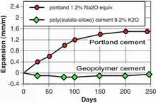 - alkali-aggregate reaction: no expansion after 250 days (−0.01%), as shown in the figure, comparison with Portland cement (ASTM C227). These results were published in 1993.[46] Geopolymer binders and cements even with alkali contents as high as 10%, do not generate any dangerous alkali-aggregate reaction when used with an aggregate of normal reactivity.[47]