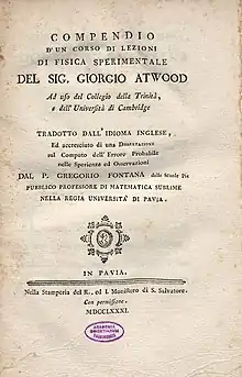 - Description of the experiments, intended to illustrate a course of lectures, on the principles of natural philosophy (in Italian). Pavia: Stamperia del Monastero di S. Salvatore <Pavia>. 1781.