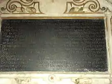 George Bromley married Joan Waverton, the daughter of John Waverton of Worfield.[3] The name is also rendered Wannerton, as on Bromley's epitaph,[1][67] and Waterton.[3] The family are described as "rather obscure"[5] and their origins are not certain, although the hamlet of Wannerton, near Kidderminster, is the main candidate.[67] The Heraldic Visitation indicates that John Waverton acquired Hallon through marriage to the heiress Alicia Barker, but Randall's history of Worfield has the Wavertons acquiring Hallon from the Barkers a generation earlier.[68] The Barker family, long the owners of Hallon, had many branches and had close links with the Hills. Joan Waverton or Wannerton long outlived George Bromley, dying on 19 November 1606 at the age of 73.[67] Of their children,