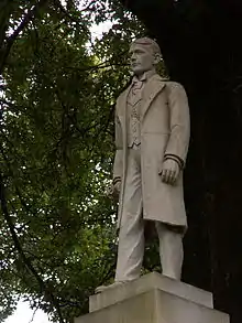 In October 1904, Smith traveled to the Winyah Sanitarium in Asheville, North Carolina, for treatment of his worsening cough, a result of advanced tuberculosis. George E. Smith died at the sanitarium on February 1, 1905. His death was attributed to "shattering of his nerves", instead of tuberculosis, due to his habit of never showing emotion.[34] Smith was interred in Union Dale Cemetery in Pittsburgh,[35] a short distance from his childhood home in Allegheny. His funeral occurred on February 5 during a snowstorm and was attended by many people.[36] He was entombed in a stone mausoleum that reportedly cost $30,000 to build and was built to Smith's specifications seven years before his death. His mother later commissioned a statue in his likeness and placed it on top of the mausoleum. The statue depicts Smith, hatless and wearing a suit, looking toward Pittsburgh while clutching a racing form.[34]