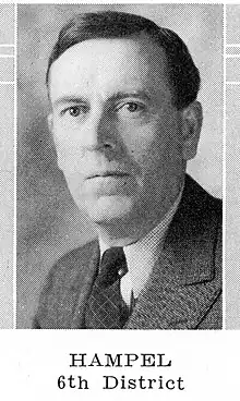 After ten years away from elected office, Hampel won election as a Socialist to the Wisconsin State Assembly representing Milwaukee County's third Assembly district in 1930, winning 2994 votes versus Republican Frank G. Pope's 2,058, and Democrat John H. Stemper's 545.[8] Two years later he ran for the Wisconsin State Senate's Sixth District seat, but lost to Democrat Charles H. Phillips. Phillips received 14,885 votes; Hampel 13,951; Republican George W. Becker 3,433; and former Republican Assemblyman (running as an independent) Martin M. Higgins 267[9] Hampel was successful when he ran again for the seat in 1936, this time running as a Progressive.[10] He was reelected as a Progressive in 1940.[11] Although Hampel had been a member of both the Socialist Party of America and the Wisconsin Progressive Party, he left the Socialists in 1941 after that party ordered its members to quit the Progressive Party.[12] He served as a vice chairman and Milwaukee County chairman of the state Progressive Party in the early 1940s.[13][14] He failed to keep his state senate seat when he ran without any party affiliation in 1944, losing to Democrat Edward W. Reuther. Reuther received 22,163 votes; Republican Arthur H. Schroeder 17,272; Hampel 4,222; and Socialist former Assemblyman and Senator Alex C. Ruffing 3,112 votes.[15]