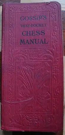 Gossip also wrote the lesser-known chess books The Chess Players' Text Book (1889), The Chess-player's Vade Mecum and Pocket Guide to the Openings (1891), Modern Chess Brilliancies (1892), The Chess Player's Pocket Guide to Games at Odds (1893), The Chess Pocket Manual (1894), The Chess Player's Mentor (with Francis Joseph Lee, 1895), The Complete Chess-Guide (with Lee, 1903), Gossip's Vest-Pocket Chess Manual (date unknown; pictured at above left), and a collection of his own games, Games: G. H. D. Gossip versus Bezkrowny, Clerc, Donisthorpe, Gocher, Gunsberg, Hoffer, Owen, Sanders, Vines Played During the Last 10 Years in England & France (1882, with Gunsberg and Steinitz).[98][99]