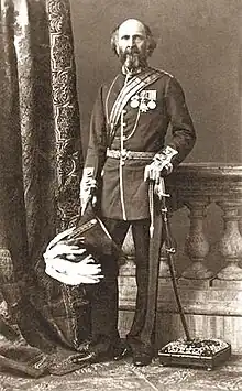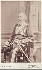 Acting under the orders of Lord Elphinstone, the Governor of Bombay, Jacob arrived at Kolapore on 14 August, a fortnight after the 27th Bombay native infantry had broken into mutiny there. Four days later he, with a mere handful of troops, quietly disarmed the regiment, and brought the ringleaders of the outbreak to justice.[3] On 4 December following, when the city closed its gates against Jacob's small force which was encamped in their lines outside, Jacob promptly blew open one of the gates, put the rebels to flight, tried by drumhead court-martial and executed on the spot thirty-six who were caught red-handed, and held the city until the mischief was past.[4] His vigour, no doubt, prevented the wave of rebellion from sweeping over the whole southern Mahratta country and overflowing into the Nizam's dominions.[5] Jacob was specially thanked in presidency general orders 8 January 1858 for "the promptitude and decision shown by you on the occasion of the recent insurrection at Kolapore", and "for the manner in which you upheld the honour of this army, proving to all around you what a British officer can effect by gallantry and prudence in the face of the greatest difficulties".[6] Jacob's powers, at first limited to Kolapore, Sawunt Warree, and Rutnagerry, were in May 1858 extended to the whole South Mahratta country, of which he was appointed special commissioner, the command of the troops with the rank of brigadier-general being subsequently added. After dealing successfully with various local outbreaks,[7] Jacob was sent to Goa to confer with the Portuguese authorities respecting the Sawunt rebels on the frontier.[8] This service successfully accomplished, he resigned his command. He remained nominally political agent in Cutch up to the date of his leaving India in 1859.