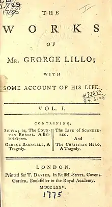 - 1 2 3 Lillo, George (1775). The Works of Mr. George Lillo, With Some Accounts of His Life. London, T. Davies.