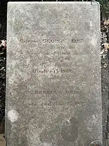 George Ord was born in England and immigrated to Southwark, Philadelphia County. On January 17, 1767, he married Rebecca Lindmeyer of Southwark, who was the sister-in-law of Reverend Eric Nordenlind, pastor of the Swedish Lutheran Church (commonly called Gloria Dei, or Old Swedes' Church) on the Delaware River.[4] George and Rebecca resided at 784 Front St., in Philadelphia.[5] They had four children including George Ord Jr., who was a famous naturalist,[5] Ann (Ord) Pinkerton, Maria (Ord) McMullen, and Henrietta Ord.[3] The family is buried at the Gloria Dei cemetery.[4]
