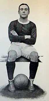 By 1903 Robey was playing at a semi-professional level. He was signed as an inside forward by Millwall Football Club and scored many goals for them.[53] He also displayed a good level of ability in vigoro,[54] an Australian sport derived from both cricket and baseball which was short-lived in England. Two years later he became a member of the Marylebone Cricket Club[55] and played in minor games for them for many years. He gained a reputation at the club for his comic antics on the field, such as raising his eyebrows at the approaching bowler in an attempt to distract him.[56] The writer Neville Cardus was complimentary about Robey's cricket prowess and called him "an elegant player" whose performances on the cricket field were as entertaining as they were on the stage.[55] Although a versatile player, Robey thought of himself as a "medium-paced, right-handed bowler".[57]