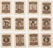 Robey's first revue of the 1920s was Johnny Jones, which opened on 1 June 1920 at the Alhambra Theatre. The show also featured Ivy St. Helier, Lupino Lane and Eric Blore[97] and carried the advertisement "A Robey salad with musical dressing".[91] One of the show's more popular gags was a scene in which Robey picked and ate cherries off St. Helier's hat, before tossing the stones into the orchestra pit which were then met by loud bangs from the bass drum.[97][n 13] A sign of his popularity came in August 1920 when he was depicted in scouting costume for a series of 12 Royal Mail stamps in aid of the Printers Pension Corporation War Orphans and the Prince of Wales Boy Scout Funds.[98][99]