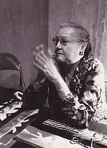 Robinson made headlines in 1968, when she served as acting president of NCAI for the 25th Annual Convention in Omaha, Nebraska, where it was noted to be "most unusual for a woman to preside".[25] She had become one of the "most influential Indian women in the country", by 1970.[26] In 1971, she served as president of the Oklahoma Federation of Indian Women and was involved in many issues concerning civil rights for Native Americans, including job opportunities, discrimination and education.[27] As both of her sisters had died by 1972, Robinson devoted more time to the store, until she closed it[17] in February 1979.[16] After its closure, she began teaching ribbonwork techniques and exhibiting her work throughout the country appearing at such venues as the Buffalo Bill Historical Center in Cody, Wyoming; the Folklife Festival of the Smithsonian, and the Wheelwright Museum of the American Indian in Santa Fe, New Mexico.[17] She also conducted demonstrations for the Smithsonian on three separate occasions.[16] In 1982, she was one of the inaugural recipients of the National Endowment for the Arts' National Heritage Fellows, in recognition for her work to preserve the needlework crafts of the Osage heritage.[28][29]