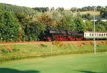 The Elster Viaduct (Elstertalbrücke) on the heavily used line from Gößnitz to Plauen was blown up by the German army on 16 April 1945. In the autumn of 1945, it was possible to resume continuous train operations after the removal of the rubble.[2] After the Second World War the line was of great importance for freight transport, since the towns on the White Elster were important industrial locations. There were also some long-distance rail passenger services to Czechoslovakia, since until the 1970s, the more easterly "upper railway" via Werdau and Reichenbach was partly only single-track due to the dismantling in the post war period and was therefore overloaded. Analogous to this was the use of the parallel Werdau–Mehltheuer railway as a relief route, but for connections to southern Germany. After the Reichenbach–Plauen line was restored to two tracks throughout, the utilisation of the lower railway also decreased. At the beginning of the 1980s, the operation of the Ex 68 Karola once again provided a high-quality long-distance connection in the form of diesel multiple units. This was made possible by the conversion from 1979 of the locomotive-hauled Vindobona trains from class VT 18.16 diesel multiple units. From 1981/82 only freight and local passenger traffic was operated. Typically class 112 (later class 202) locomotives were used in passenger traffic and class 120 (later class 220) locomotives were used in freight traffic.