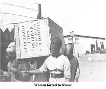 The neighbouring British objected to what they regarded as the inhumane German policy. This involved maintaining a number of concentration camps in the colony during their war against the Herero and Nama peoples. Besides these camps, the indigenous people were interned in other places. These included private businesses and government projects,[12] ships offshore,[13][14][15] Etappenkommando in charge of supplies of prisoners to companies, private persons, etc., as well as any other materials. Concentration camps implies poor sanitation and a population density that would imply disease.[16] Prisoners were used as slave labourers in mines and railways, for use by the military or settlers.[17][18][19]