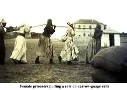 - ↑ "Forcing women to pull carts as if they were animals was in tune with the treatment generally meted out to Herero prisoners in Lüderitz as elsewhere in the colony." Erichsen 2005, p. 84