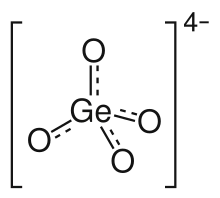 Germanium is similar to silicon forming many compounds with tetrahedral {GeO4}[2] units although it can also exhibit 5[3] and 6[2] coordination. Analogues of all the major types of silicates and aluminosilicates have been prepared.[4] For example, the compounds Mg2GeO4 (olivine and spinel forms), CaGeO3(perovskite structure), Be2GeO4 (phenakite structure) show the resemblance to the silicates.[4] BaGe4O9 has a complex structure containing 4 and 6 coordinate germanium. Germanates are important for geoscience as they possess similar structures to silicates and can be used as analogues for studying the behaviour of silicate minerals found in the Earth's mantle;[5] for example, MnGeO3 has a pyroxene type structure similar to that of MgSiO3 which is a significant mineral in the mantle.[6][7][8]